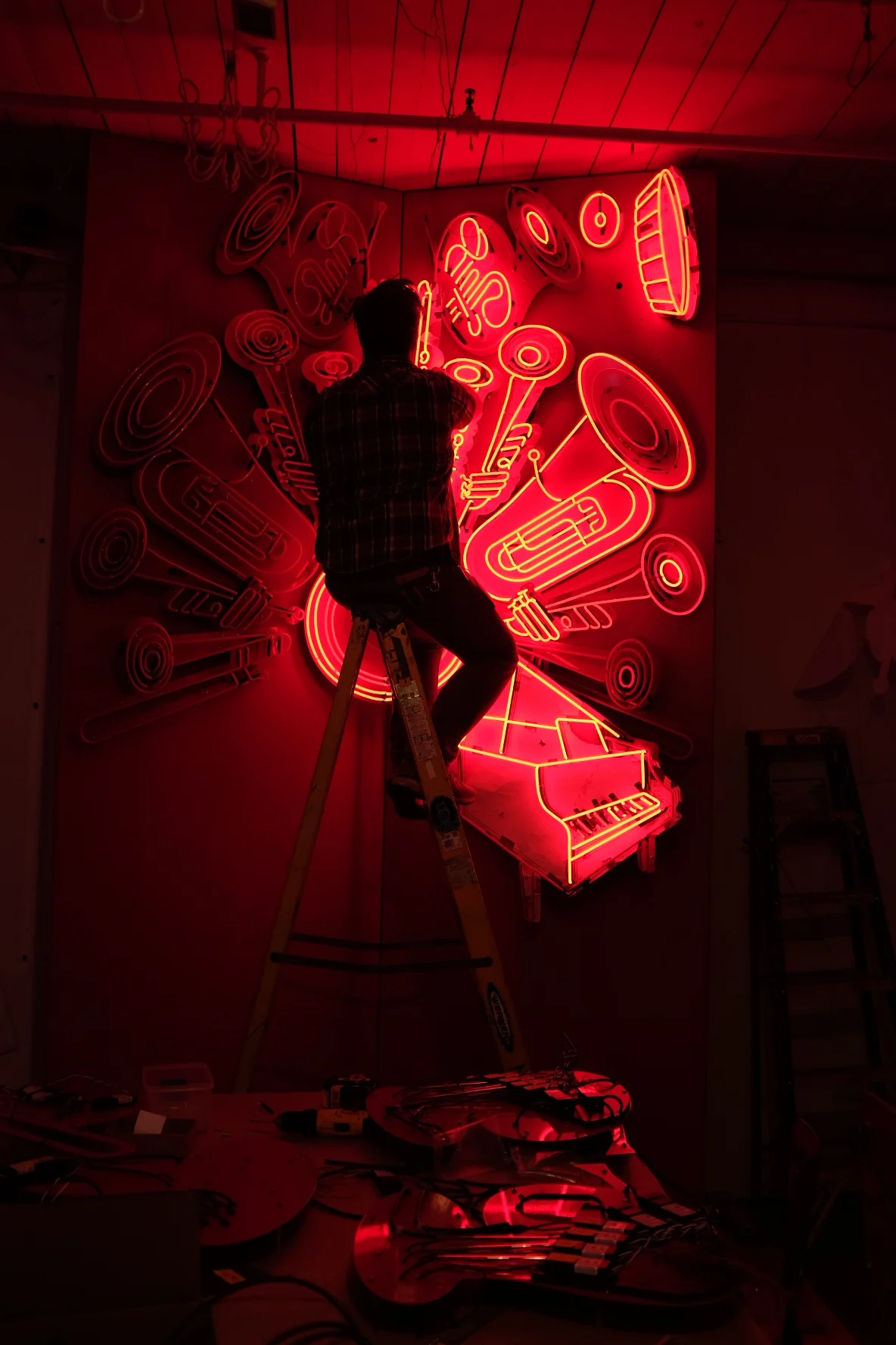 Since the piece required working with the natural environment, we rethought how to produce glasswork and wiring for exterior use, working over many months to prototype our final technical design. Throughout the process, I managed everything from layout and glass production to timing and wiring. I also designed a hanging system for neon tube suspension, oversaw the multi-day install, and functioned as a liaison between the artist, landscapers, and ground crew.